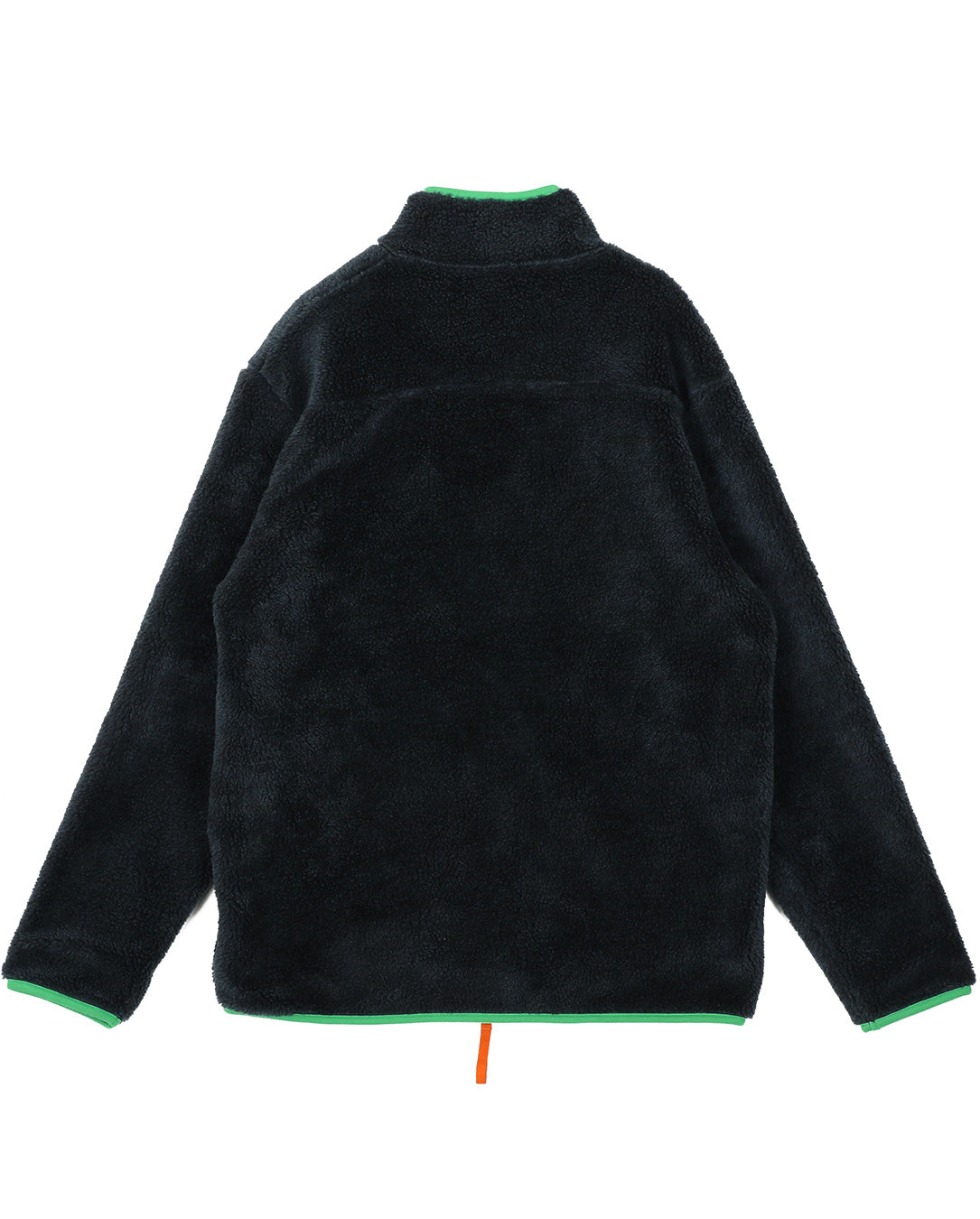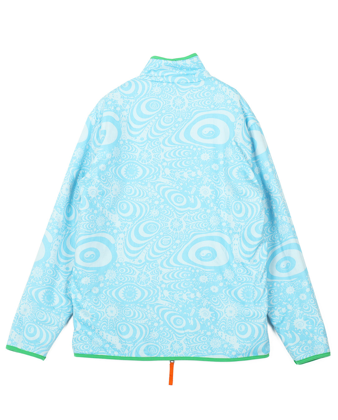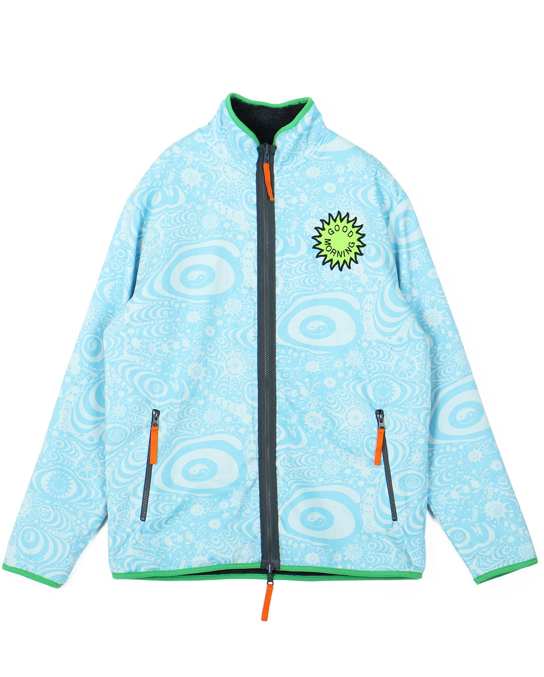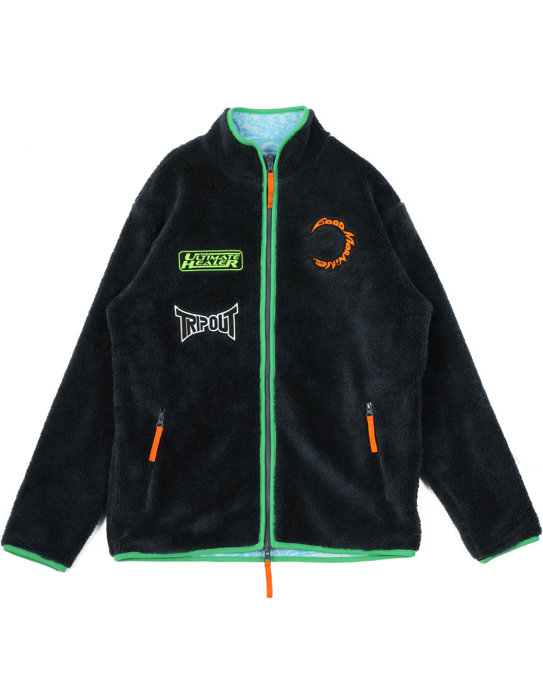 A fleece jacket with high heat retention. Piping specifications with unique color scheme. GMT original embroidered patches are placed in three places. The back side is cotton fabric with an original psychedelic pattern. Double slide zip.