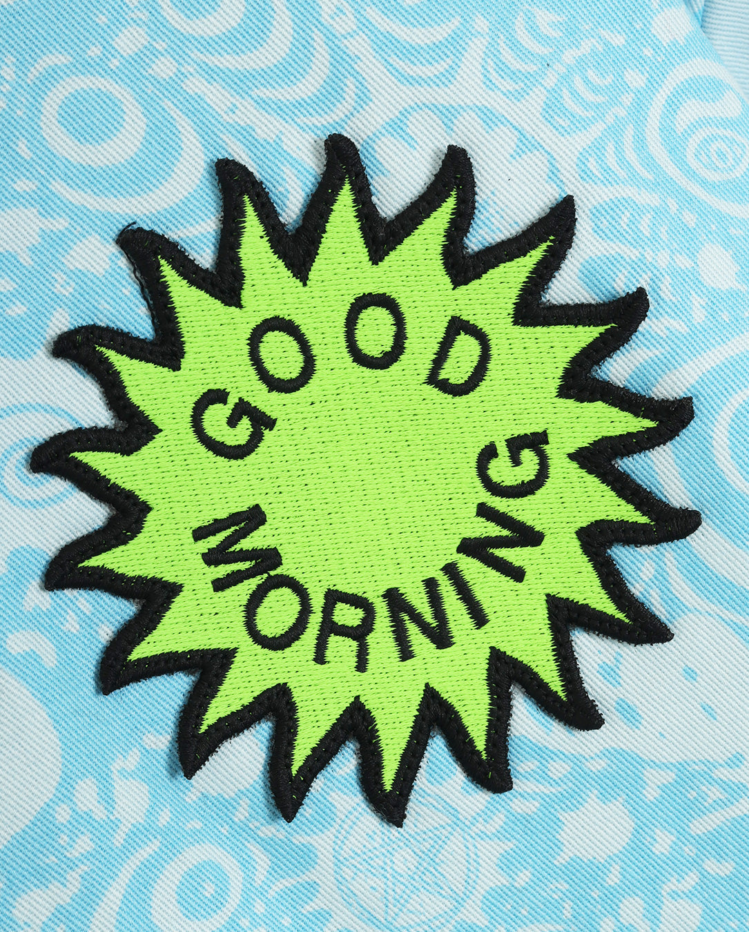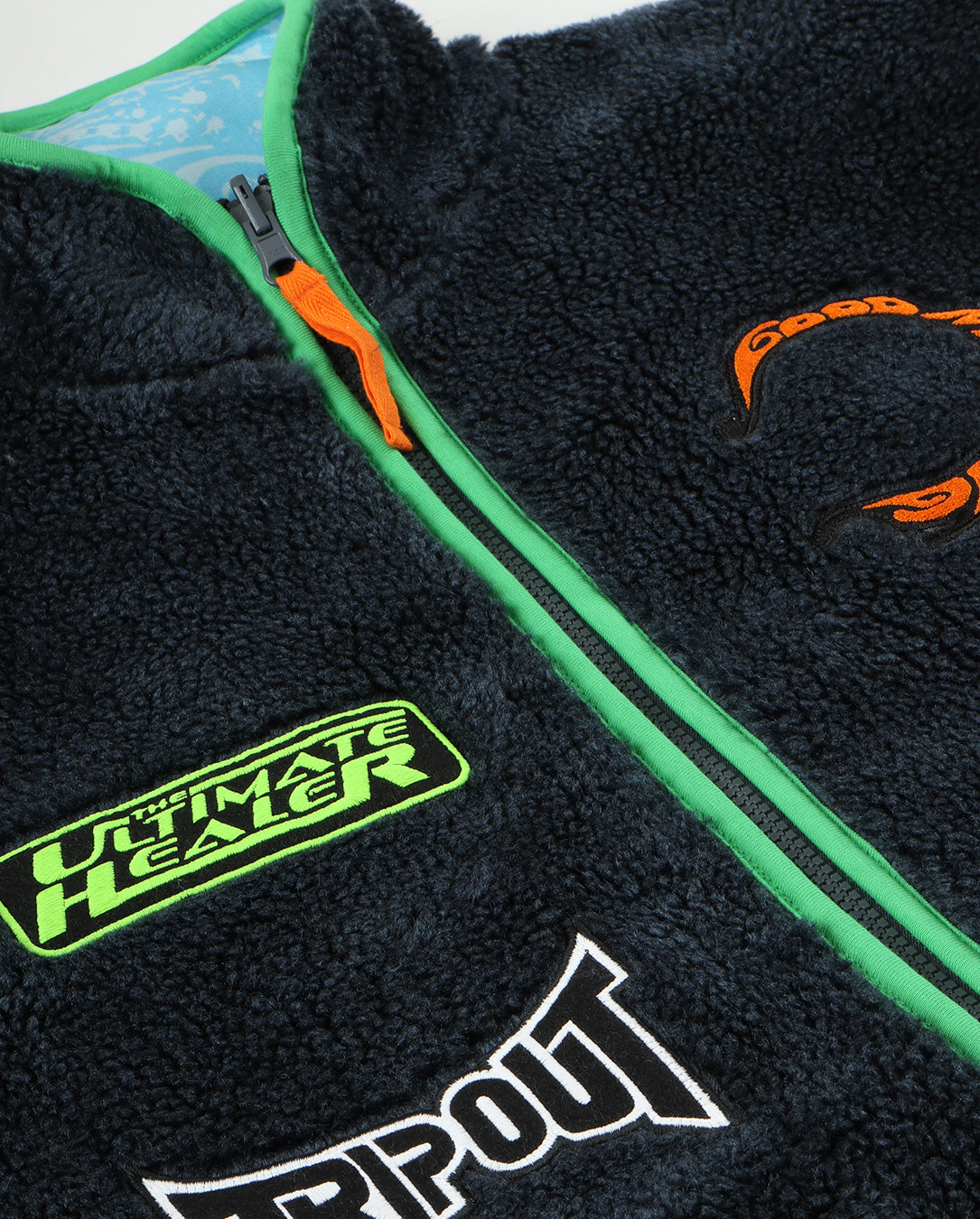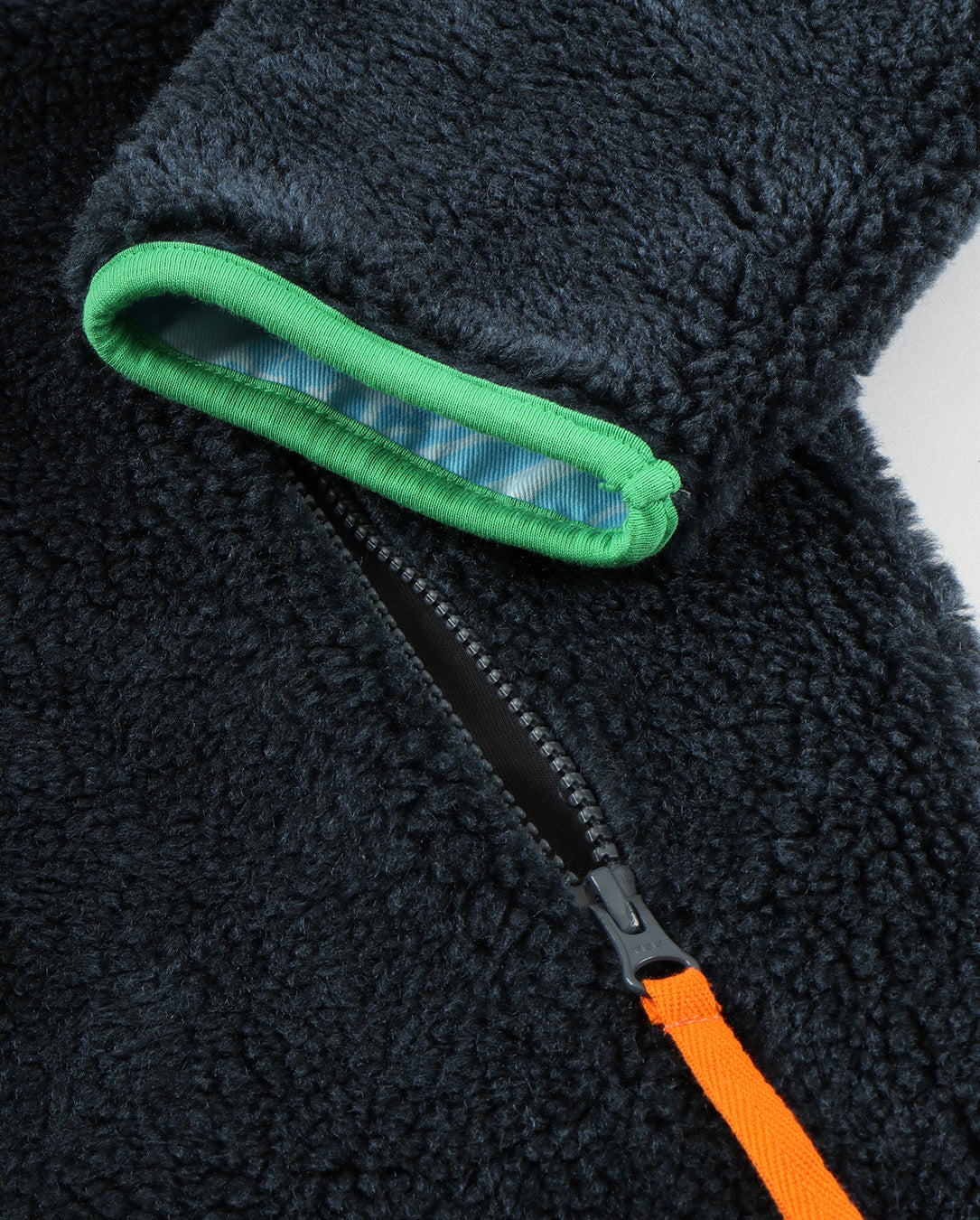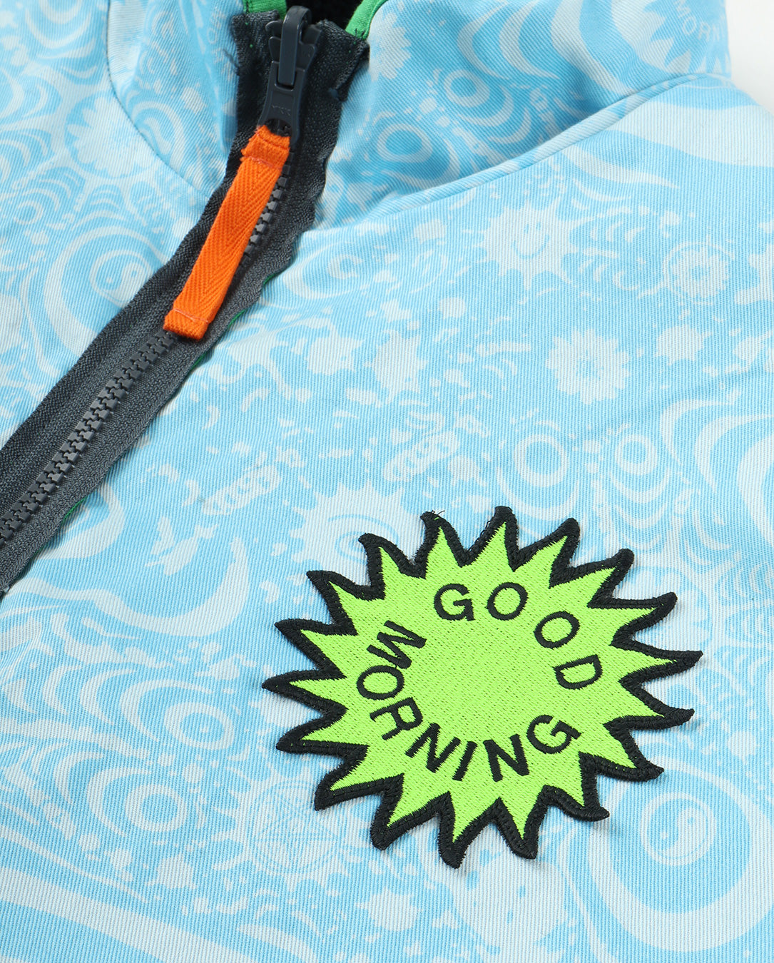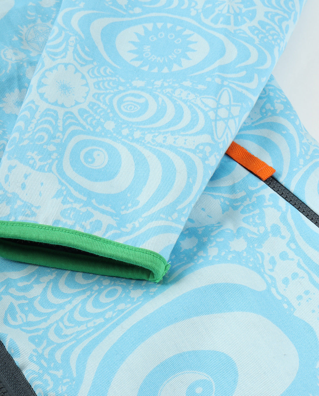 A fleece jacket with high heat retention. Piping specifications with unique color scheme. GMT original embroidered patches are placed in three places. The back side is cotton fabric with an original psychedelic pattern. Double slide zip.
