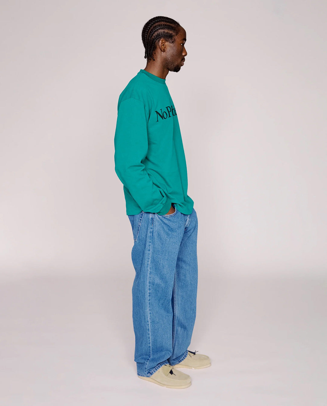 unisex vintage-cut 90s style skate jeans, meant to be worn super baggy made out of 100% cotton denim. featuring a no problemo embroidery on the back and alien-o leather patch