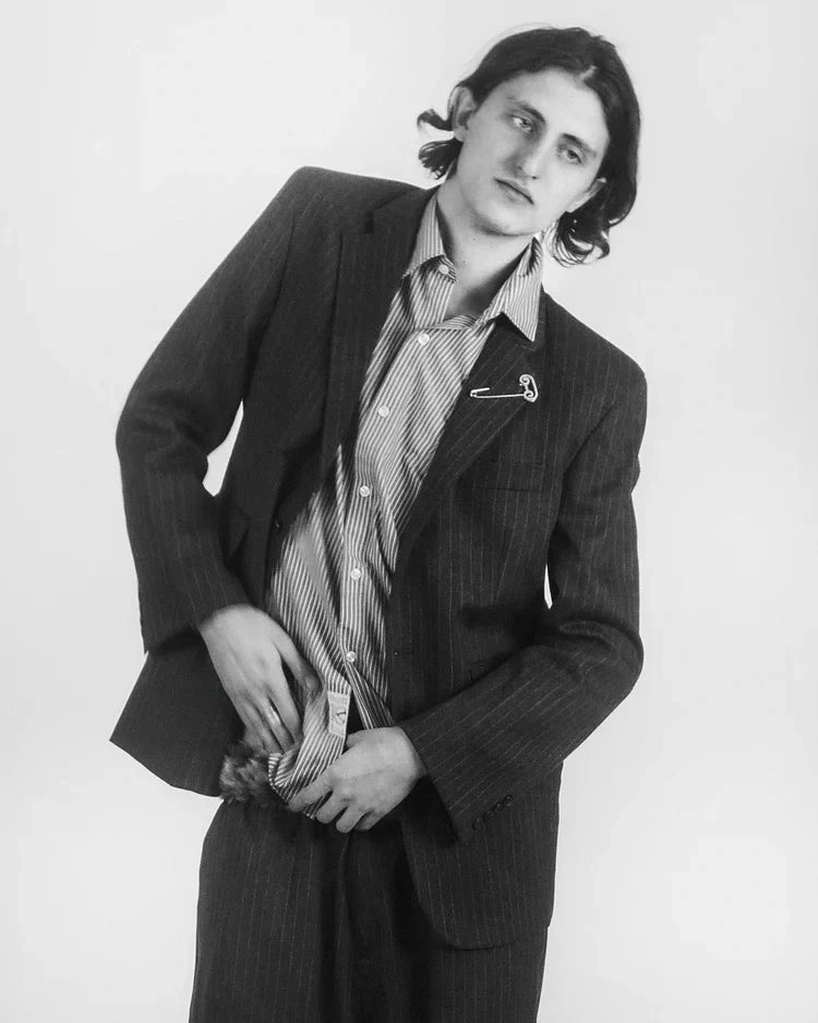 gold-tone column safety pin with hanging roman coin. mixed metals.