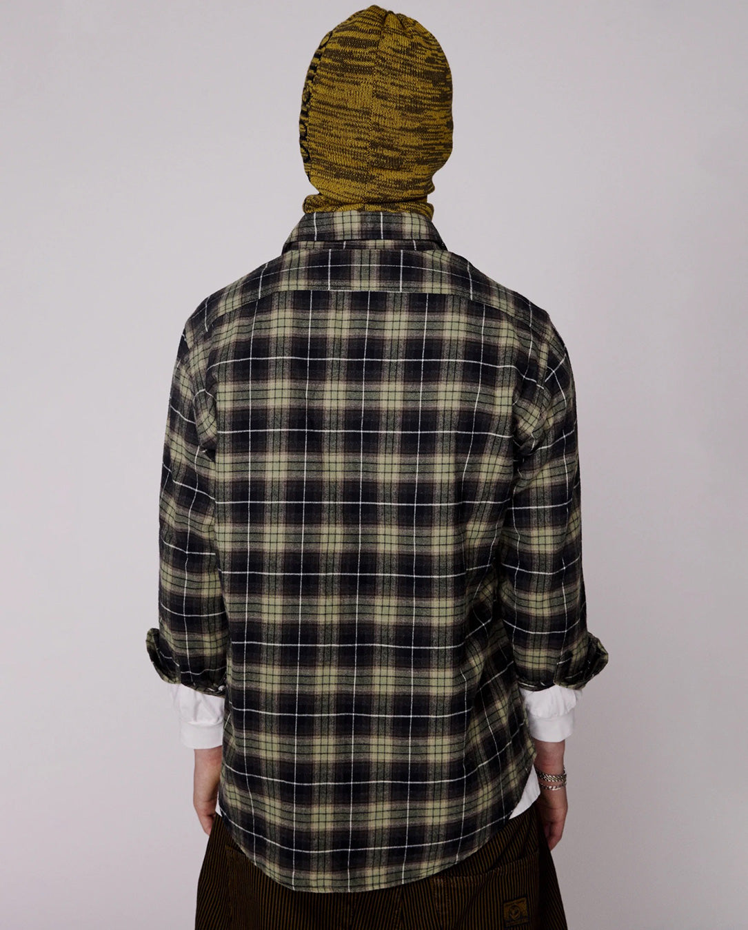 A checked long-sleeved flannel shirt with a No Problemo logo print on the chest.