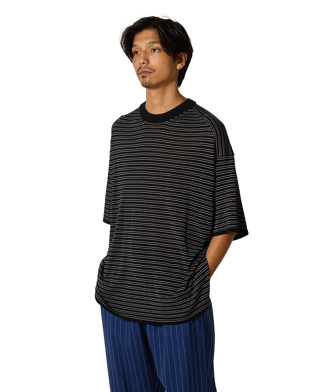 再生繊維(セルソース)、レーヨンをミックスした糸を使用しています。抗菌、冷感の機能も兼ね備えています。ハイゲージな天竺編みにして程よい光沢感を出し、滑らかな肌触りにしています。襟は針抜きリブ仕様にしています。程よい身幅のシルエットです。